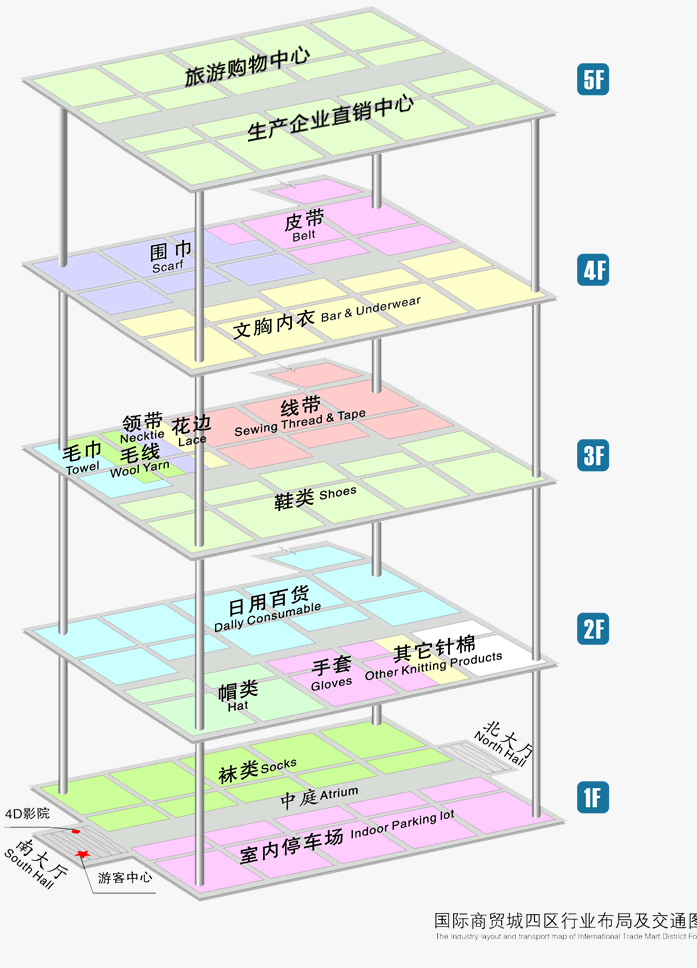 中国义乌国际商贸城四区于2008年10月21日正式开业,市场建筑面积达108万平方米,拥有商位16000余个,现有经营主体19000余户。市场一楼主营袜类;二楼主营日用百货、手套、帽类、针棉;三楼经营鞋类、线带、花边、领带、毛线、毛巾;四楼主营文胸内衣、皮带、围巾。现代物流、电子商务、国际贸易、金融服务、餐饮服务等市场配套服务齐全,市场还拥有4D动感影院、旅游购物等特色商业服务。 整个四区市场借鉴运用当前国际大型商业中心先进的设计理念,融多项高科技于一体,市场内设有中央空调、大型电子信息屏、宽带网络系统、液晶电视系统、太阳能发电设施、雨水回收器、自动天窗及平行扶梯等先进的高科技硬件设施,是目前国内科技含量最高、国际化水平最高的商品批发交易市场,同时,也是义乌市场现代化的标志性建筑。